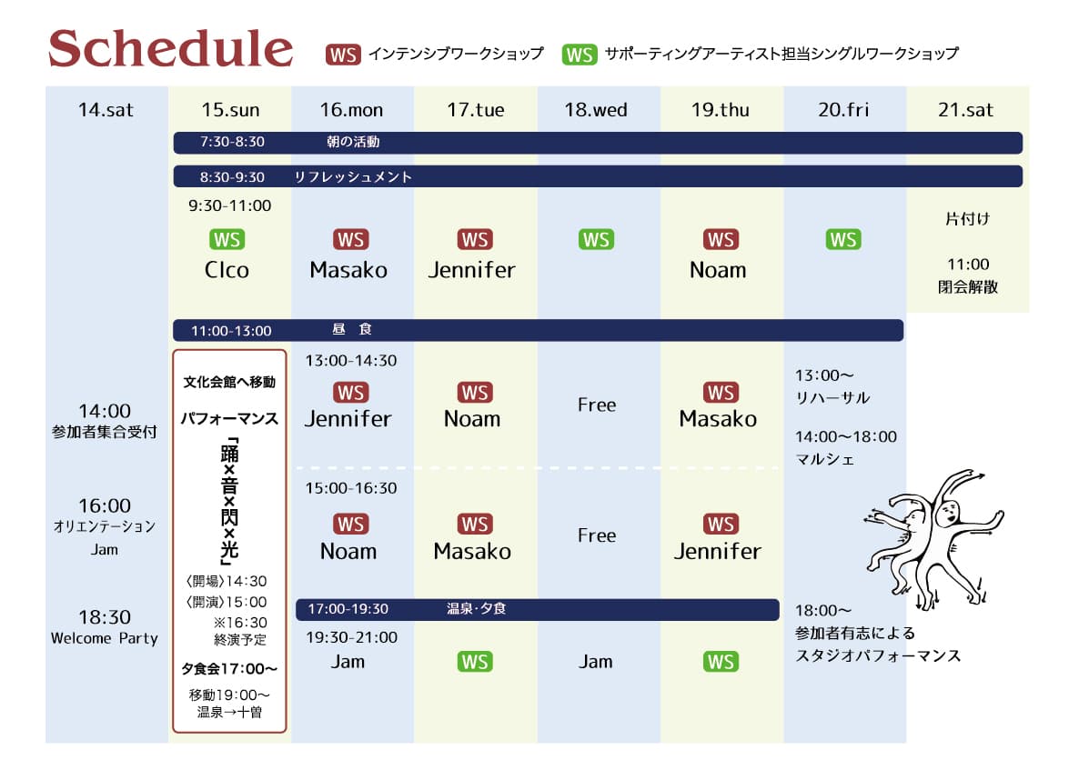 豪華講師陣とi-Danceオーガナイザーズたち、3人の音楽家、美術家、そして3人の照明家がガップリ組みあいます。